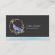 Ett boho stil-affärskort med en grafisk illustration som består av en varg med lila vattenfärg, i en klassisk hovling. Omgiven av en illustrerad krans av trä, kristaller, fjädrar och pärlor. Coola native american stammotif.