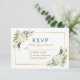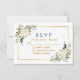 Vattentärsfärgat Ivory White Blommigt Greenery Bröllop OSA Card innehåller elfenbenskräm vit ros och botaniskt grönämne. Guld Ram, Guld-skript, Dusty Blue Back