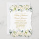 Inbjudningskort för elfenbensfärgad ivoriansk vit Blommigt Greenery Wedding innehåller elfenbenskräm vit ros och botaniskt grönt. Guld-skript, dammblå bakåt, hakparentes Stil