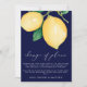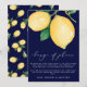 Behöver du skjuta upp ditt bröllop? Skicka ut detta meddelande om ändring av planer till dina gäster. Meddelandet har gula vattenfärgade citroner och gröna blad, som anspelar på det populära uttrycket "när livet ger dig citroner, gör lemonad". Bakgrunden är i en slående marinblå färg, med "förändring av planer" i vit modern kalligrafi och ditt meddelande i vitt sans-serif-teckensnitt.