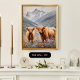 Denna poster är en målning av två högrindar i ett naturligt landskap. Korna har långa päls och horn, och de omges av färgstarka blommor. Bakgrunden visar ett bergsområde med snö och dimma. Poster har en mjuk och serene färg palett. 🎨
