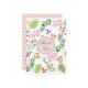 Tack med det här vackra, vår-vattenfärgstacket. Den har löv i grönt, guld, rosa och grått. Sprig av vilda blommor från rosa och lila kompletterar färsk land.