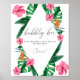 Tropical Handflatan Watercolor Inbjudningskort för möhippan. Konstruktionen har en vattenfärgad elegant buquet av klassisk strandvattenfärg, grönenergi och blommor, inklusive rosa hibiscus, orange och blåa fåglar av paradiset, grönt grey och mörk grönt handflatan löv.