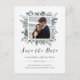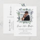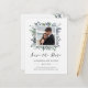 Det här moderna botaniska bröllops-kortet för att spara datumet har en mittram med ert foto och vattenfärgblad i trendiga nyanser av grönt, blått och grått för en stilren look som är både minimalistisk och rustik.