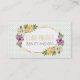 Snygg blommigt Beauty salon och Spa feminin-affärskort med vackra vita, gult och lila vattenfärgblommor och en guld-folie-polygon. Bakom den finns en grönt och vit polka punkt mönster.