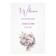 Det här välkomsttecknet för bröllop visar en målad vattenfärgad bukett med ett enastående kalligrafteckensnitt och ett modernt typsnitt.