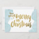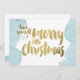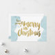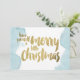 Ett julkort med blå vattenfärg och guld-folie. Och ord: Ha en trevlig liten jul.