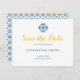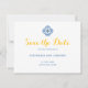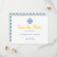 Meddela dina gäster om ditt kommande firande med Medelhavsfärgen Tile Watercolor Lemon Bröllop spara datum. En gult och en blå spansk ruta inslag på framsidan med roligt men ren typografi i elegant, medan baksidan skryter med en sjudande bricka mönster och citron som visar regionerna Andalusien, Spanien och Amalfi Kusten, Italien.