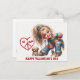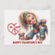 Alla hjärtans vykort på dagen med en vattenfärgad illustration av en ung flicka med stort, mousserande blått ögon och ett smittsamt leende med ett långt vågigt blonda hår med färgat huvudband. Hennes boho-chic är utrustad med en regnbågsskuren blus, lappverksjeans med broderade mönster och med skiktade armband och halsband. En liten, fluffy hund med ett sött, uttrycksfullt ansikte sitter bredvid henne. Ett rött hjärtformat fredstecken som innehåller frasen "Be min" som visas på lämnat av illustration. Glad Alla hjärtans dag i hälsning i rött lekfullt reflexteckensnitt som visas nedan bild. Rött hjärtformat fredstecken som visas på baksidan i nedre lämnat hörn med utrymme för skriva av en personlig anteckning.