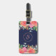 Denna bagagetagg har en modern vattenfärgsutformning med rosa och korall rosor, blad och faux ro guld glitter på marin blommigt. Anpassa monogrammet med din inledande text och lägg till kontakttexten på baksidan.