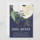 En söt och modern inbjudan till babydusch i marink, grönt, vit och faux guld glitter, med vattenfärgen ro och löv och ett penselerat stil-teckensnitt.
