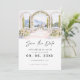 Ange tonen för speciella dag med den här eleganten Vattenfärgen Venue Bröllop spara datum. Med en vackert illustrerad vattenfärgsbild av din plats i bröllop kombinerar den här designen tidlös konst med en personlig beröring. De mjuka penseldragen och den ömtåliga paletten färg skapar en romantisk och inspirerande estetik som på ett perfekt sätt fångar kärnan i det kommande firande.