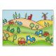 Vattenfärgillustration av rullande lantgårdbackar och traktorer