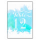 Modern abstrakt akvblått stänk med stjärnfisk och fiskmås bröllopskort för bordsnummer med handmålad vattenfärg stänk med struktur i ton med akvblått och turkos, två stjärnfiskar och fiskmås i vitt och med vit text. Den här avslappnaden för elegant och snyggt i bröllop är en perfekt för hela anpassadet för din sommarstrand eller målbröllop. Observera att detta bara är en vattenfärgsbild och inte en riktig struktur.