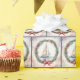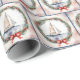 Havsfärgad segelbåt på blå vatten i en julkrans med rött båge och abstraktens bakgrund