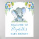 Välkomstskylt Poster för den blåa Blommigten Baby Elephant Baby Shower. Omfattar vackra vattenfärgsblåa och vita blommor med botaniskt grönt och ferns.