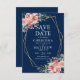 Fintvätt och elegant bröllop spara datum-kort i en rosa, dammig ro med grön färg - marin blå bakgrund. Modern faux guld-design ram. Lättredigerbart, DIY-mallkort. Bride och Groom namn på baksidan. Alla färger och all text kan ändras/redigeras. Kontaktdesigner för andra variationer. Se andra artiklar i bröllop-svitsamlingen "CHRISTINA".