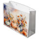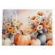 En vacker höstscen med vibrerande pumpor omgiven av en samling vita blomsterarrangemang i vas. Bakgrunden är mjukt suddig med pastellnyanser, skapande av en seren och inbjudan till atmosfär, perfekt för att fira fall. Designad av konstnären Danguole Serstinskaja