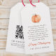 Happy thanksgiving i modern serif-typografi med höstpumpa i vattenfärg. Detta djurutrymmeskort är fäst vid paj eller bakade varor. Denna märkning är särskilt avsedd för bagerier eller alla som säljer livsmedel på Thanksgiving. Dikt: Säsong-smaker, bakade till perfektion, för val av Thanksgiving. Aroman fyller rummet och kan jaga bort vilket dystert som helst. Grattis, en bita i taget, från vår kök och rytm. Finns här: http://www.zazzle.com/store/selectpartysupplies