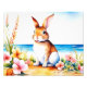 Påskhare på en tropisk strand med blommor och ägg.