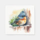 Vattenfärgad fågel med en blandning av blått, orange och vita fjädrar på ett trästängsel med en bakgrund av grön