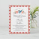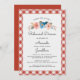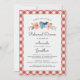 En repetitionsinbjudan till roligt bröllop med en vattenfärgssväljare och dina repetitionsdetaljer som ramats in av ett rött och vitt kontrollerat gräns. Perfekt för ett utomhusträdgårdsbröllop, rustik lada bröllop, picknick i parken, bakgårdsmat BBQ-middag - roligt och avslappnad ännu klassisk och enkel.