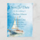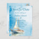 Vårt vackra sjöfärs Sailboat-Bröllop spara datum-kort är perfektens blandning av en biskopisk, tropisk karfriträd. Den blå vattenfärgen fungerar som en vacker bakgrund och accentuerar serensjöbåten.