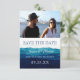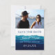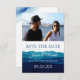 Modern och roligt Spara datumet med vattenfärgen vinkar och tvättar, med vackra nyanser av marin, blått, ljusblått. Konsten liknar oceanen vinkar eller bergen. Elegantens typografi. Ljusblå vattenfärgsfläckar på baksidan.