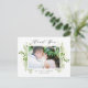 Vattentärsfärgat Foliage Photo Bröllop Tack-vykort. Skicka ett tack till familj och vänner för att de är en del av din bröllopsdag med anpassadets gröna tack för ditt vykort. Den har vattenfärgsblad ram med ett snyggt skript. Anpassa genom att lägga till egna detaljer och visa ditt favoritfoto från bröllop. Detta vykort kommer också att vara perfekt för studenten och andra evenemang.