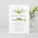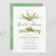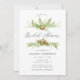 Grönt och vitt inbjudningskort för möhippan med ferner, vilda blommor och jordgubbar och en grönt med sage-vattenfärg tvättar bakgrund.