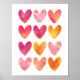 Rosa och orange vattenfärgshjärtan poster att utskriften är ljus och roligt, det ser ut i ett barnrum eller i ett vardagsrum.