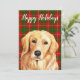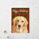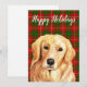 Julkort med vattenfärgsillustration av en Golden Retriever hund på festlig grön och röd rutig bakgrund och anpassningsbara julhälsning.
