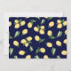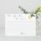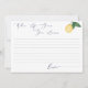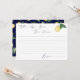 Möhippans rådgivningskort med rubriken "När livet ge dina citroner" i ett marint modernt kalligrafteckensnitt och en enda vattenfärgscitron med löv. Omfattar grått guide linjer och kärlek signering. Baksidan har en marin blå bakgrund med mönster av vattenfärgscitroner och löv.