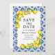 Vattenfärgslemoner och grön på blå plattor Spara datumet Förlovning Bröllop annons-kort