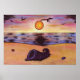 vattenfärgsmålarmussla på stranden medan solnedgån poster