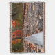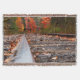 Marknivåvy över en vacker fallscen med en rälsbana som färdas genom rödbläckat träd på hösten i Michigans övre Peninsula. Detta är en digital färgsmålning i stil som kommer att tilltala resenärer, tåg-tjur och dem som reser norrut i kärlek.