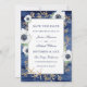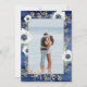 Modern vattenfärgsgrafik med ett vackert ram av anemonblommor, stjärnfisk, knoppar och kvistar. Teckensnittskombination för elegant. Vit, mörkblå, guld (inte äkta guld utan färg). Djupblå silkesfärgen vinkara ram. Perfekt för elegant i det moderna bröllop, blommigt bröllop.