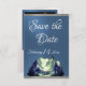 Vattenfärgsberg 2 Spara datum har stora vattenfärgsberg i blå och grönt på en blå satängbakgrund med platshållare för informationen. Ett foto av paret bröllop finns på baksidan av kortet. Om du vill ändra information klickar du på "Anpassa". Om du vill flytta texten eller ändra texten storlekt, teckensnitt eller färg klickar du på "Klicka för att anpassa ytterligare"