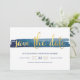 En sofistikerad chic sparar datumet som balanserar en handmålad vattenfärgspensellinje som är lagrad bakom en trendig-skriven faux-guld-folie "spara datumet" med en ren typografisk layout.