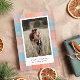 En rustik helgdag-kortdesign för elegant som har en färgstark vattenfärgad bakgrund i skuggor av CORAL ROSA, LIGHT GRÅTT OCH Blek Blue med rum med foto (lodrät eller porträtt). "varmaste önskemål" eller ditt val av hälsning visas under fotot, tillsammans med din familj namn och året. På baksidan finns ett utrymme för ytterligare foto (vågrät- eller liggande orientering) och ett personligt meddelande