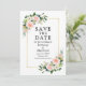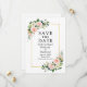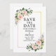 Elegant Watercolor Rosa Ro and White Flowers Save Date Bröllop Annocementkort innehåller botaniskt grey på guld ram.