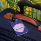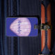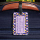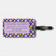 Skriva kontaktinformationen eller särskilda instruktioner på bagagetaggen som finns på baksidan mönster av rött, gult och violett kontrollfält i vattenfärg, på blå bakgrund. Lägg till ditt namn eller monogram på det violetta säsongsskalet på framsidan.