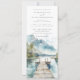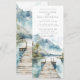 En idyllisk vattenfärgsskog sjö i mjuka blues och gröntar, med pier kant i sjö, med vergregrönt träd och berg i avstånd. Rustic och serene. Finns i utskrift, som digital nedladdning, eller båda. Lämpligt för en bergsskog i bröllop, utomhusvildmark i bröllop och vid bröllop.