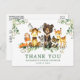 Vattenfärg Skogsdjur Baby Shower Tackkort. Bebisdjur inkluderar Björn, Hjort, Älg, Tvättbjörn, Kanin, Räv och Uggla på eukalyptusblad och skogsgrönska.