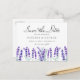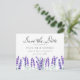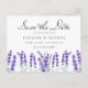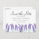 Spara datumet! Meddela din bröllop-dejt till familj och vänner med den här elegant blommigten att spara datumet på vykortet. Den har en vattenfärgad illustration av lavender-blombuketter och vismiskt skript. Anpassa genom att lägga till namn, datum, plats och annan information. Lila blommigt spara datumet vykort är perfekt för vår och fallbröllop.