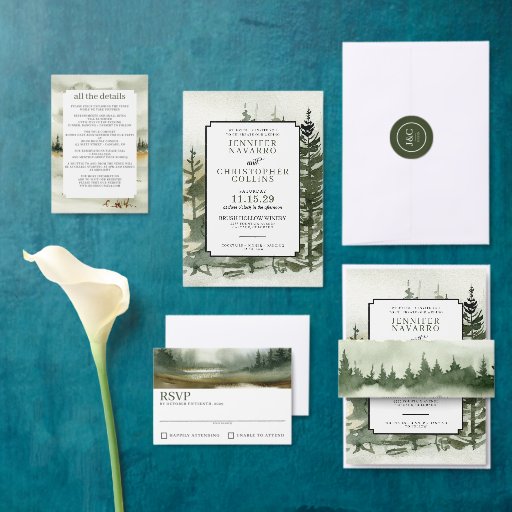En vacker skogsdesign...underbar för många olika miljöer och stilar. Ett utrymme för information på baksidan med en QR-kod gör att en underbar blir allt på ett kort. Om du vill ha hjälp med att anpassa inbjudan ytterligare kan du skicka ett meddelande till oss.