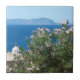 Vattenfärgsvy med blommor i blommar, vit torn och havs- och bergsvy på en grekisk ö