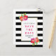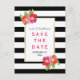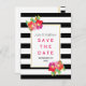 Vackra rosa och lila tropiska akvarellblommor, chic svart-vit randigt mönster och din text på en vit ram pryder detta enastående bröllopskort för Spara datumet. Välj det för ditt vår- eller sommarbröllop.