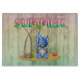 Vattenfärgad loungande strandgnom med en cocktail bredvid handflatan träd och vattenmelon SOMMMER-folie-ballonger som sätts upp på en rosa och grönt av träkornbakgrund.
