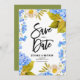 ditt bröllop-datum med det här anpassadet spara datumkortet. Den har vattenfärgsfärgad blommigt ram i vattenområden, vita blommor och grönska. Anpassa den här blommigten spara datum meddelande genom att lägga till information. Den här blåa brandkåpan sparar datumkortet som perfekt för vår och vinterbröllop.